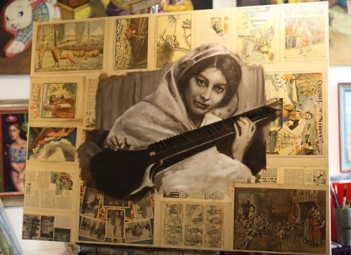 Chelf is standing by the easel, a nearly finished portrait of a young woman staring out at us. The woman in the portrait holds a sitar in both hands and hints of a mischievous smile on her face. She floats in monochrome upon a collage of hand-drawn illustrations from an old French magazine.